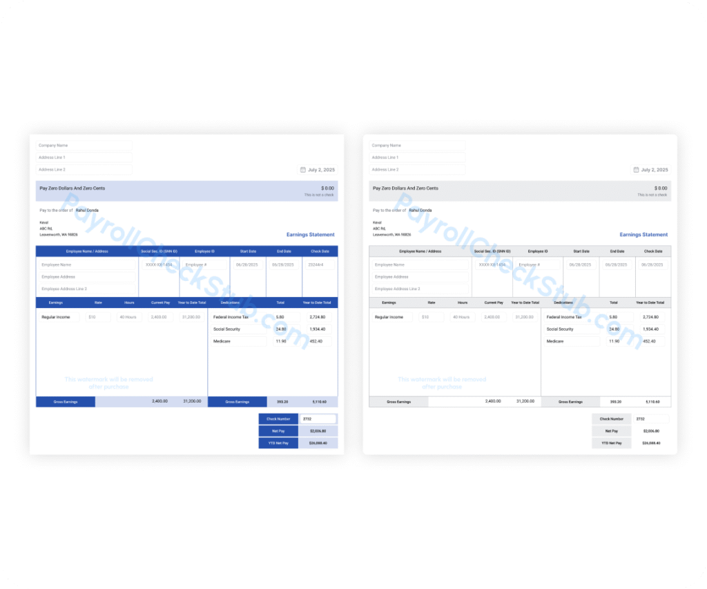 Create the perfect pay stub for your employees with our free online payroll stub generator. It’s fast, easy to calculate, generate, and print all in just a few clicks!